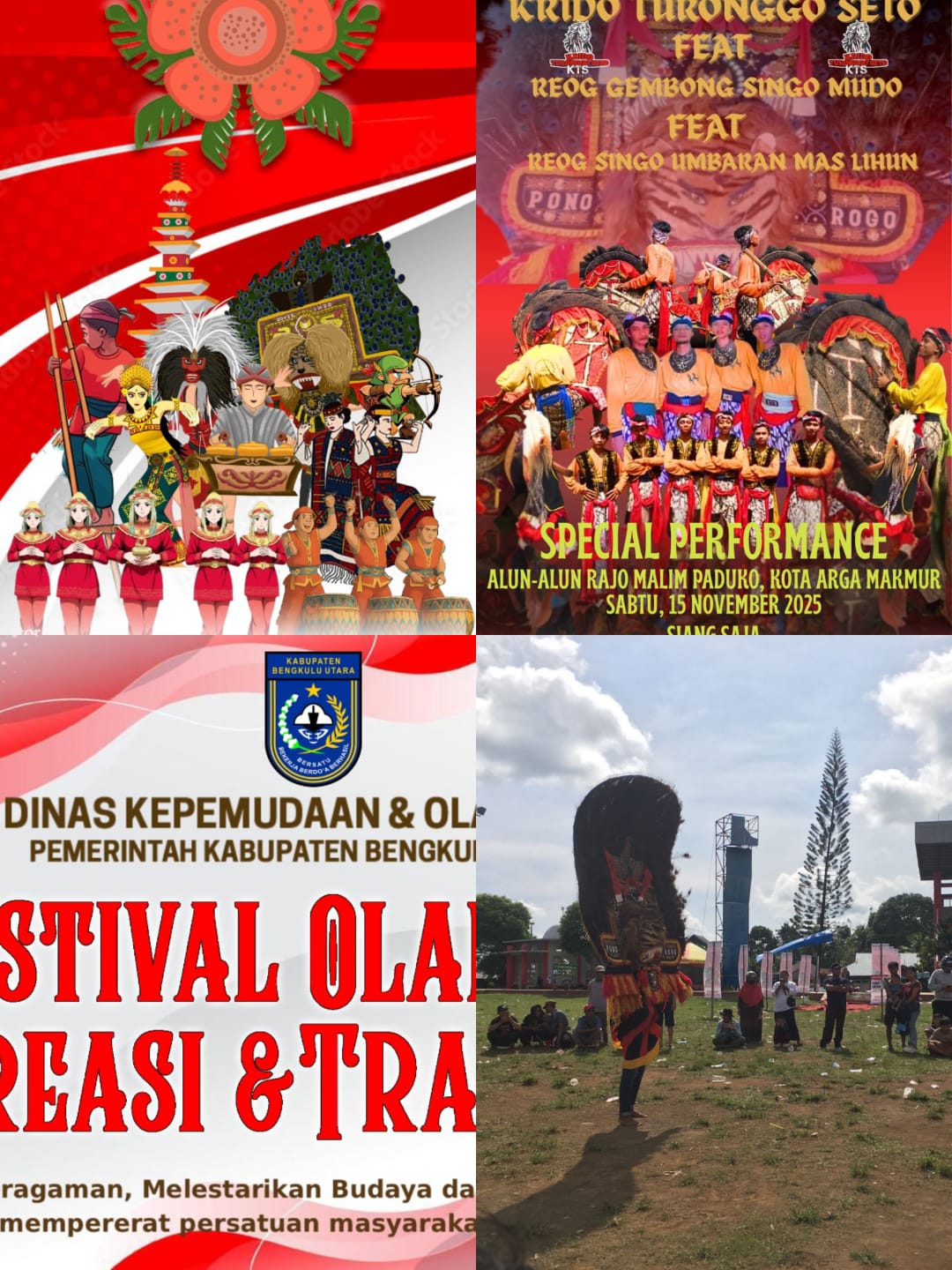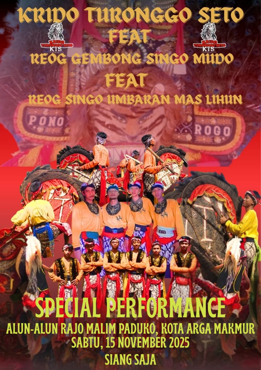 SETAMANG.COM, BENGKULU UTARA – Penampilan Pentas Kuda Kepang dan Reog KRIDO TURONGGO SETO FEAT REONG GENBONG SINGGO MUDO FEAT REONG SINGO UMBARAN MAS LIHUN di Festival Olahraga Rekreasi dan Tradisional yang spektakuler di selenggarakan oleh Pemerintah Kabupaten Bengkulu Utara di Alun-alun Rajo Malim Paduko, Kecamatan Arga Makmur. Sabtu, (15/11/2025).